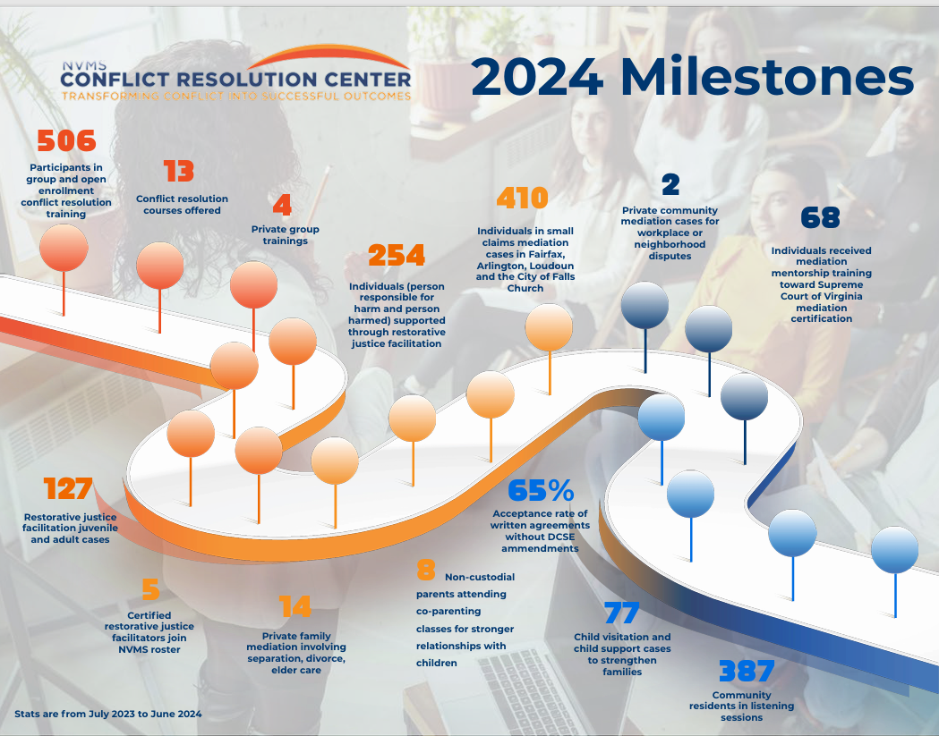 In 1990, a group of graduate students from the George Mason University School for Conflict Analysis & Resolution (GMU S-CAR) came together to put into practice the dispute resolution skills acquired through their educational and experiential journeys. Beginning as a mediation clinic, this laboratory experiment grew to become an affiliate of GMU as its own non-profit 501(c)(3), known as the Northern Virginia Mediation Service.